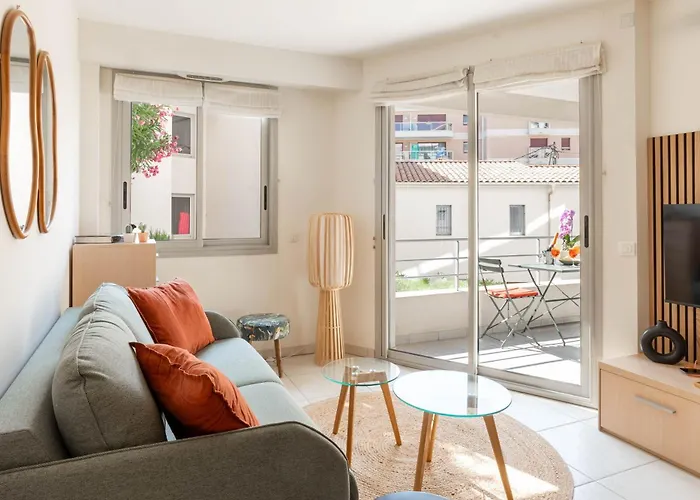 Lägenheten Le Cocon De La Pinede - Antibes Proche Plage erbjuder gästerna vardagsrum och ett komplett kök, samt moderna bekvämligheter som luftkonditionering och tvättmaskin. På detta boende finns ett badrum utrustat med torktumlare, gratis toalettartiklar och handdukar. Det finns också en separat toalett.